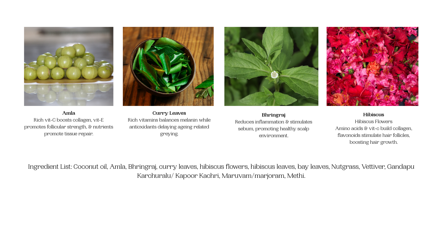 Amla and hibiscus are rich in vitamin C and amino acids that boost collagen production and stimulate dormant follicles, encouraging new hair growth. Bhringraj and curry leaves strengthen the roots, reduce hair fall, and promote the growth of thicker, healthier strands.
