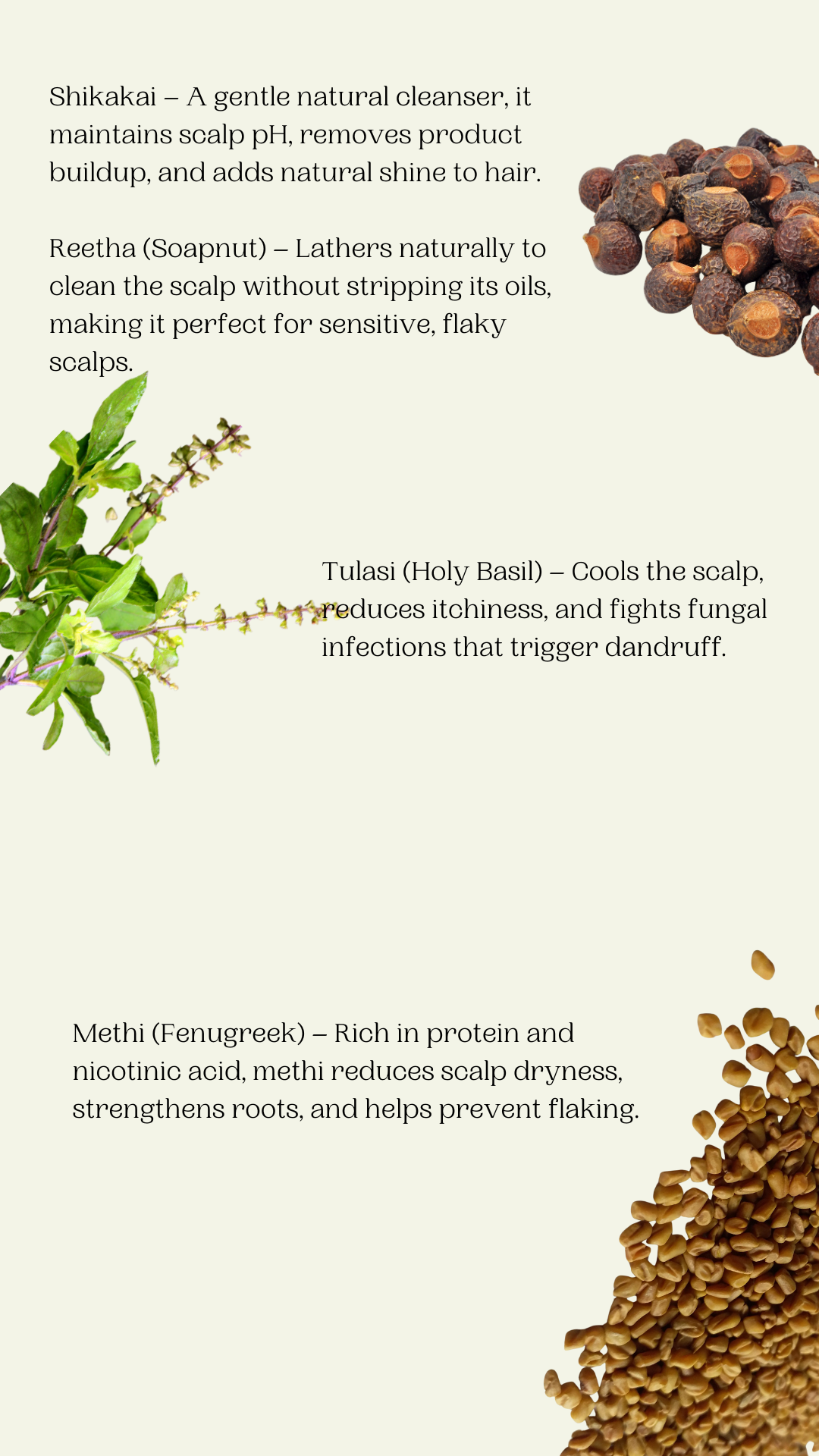 Neem , Methi, Tulasi, Triphala, Bhringraj, Shikakai, Reeta, Lemon